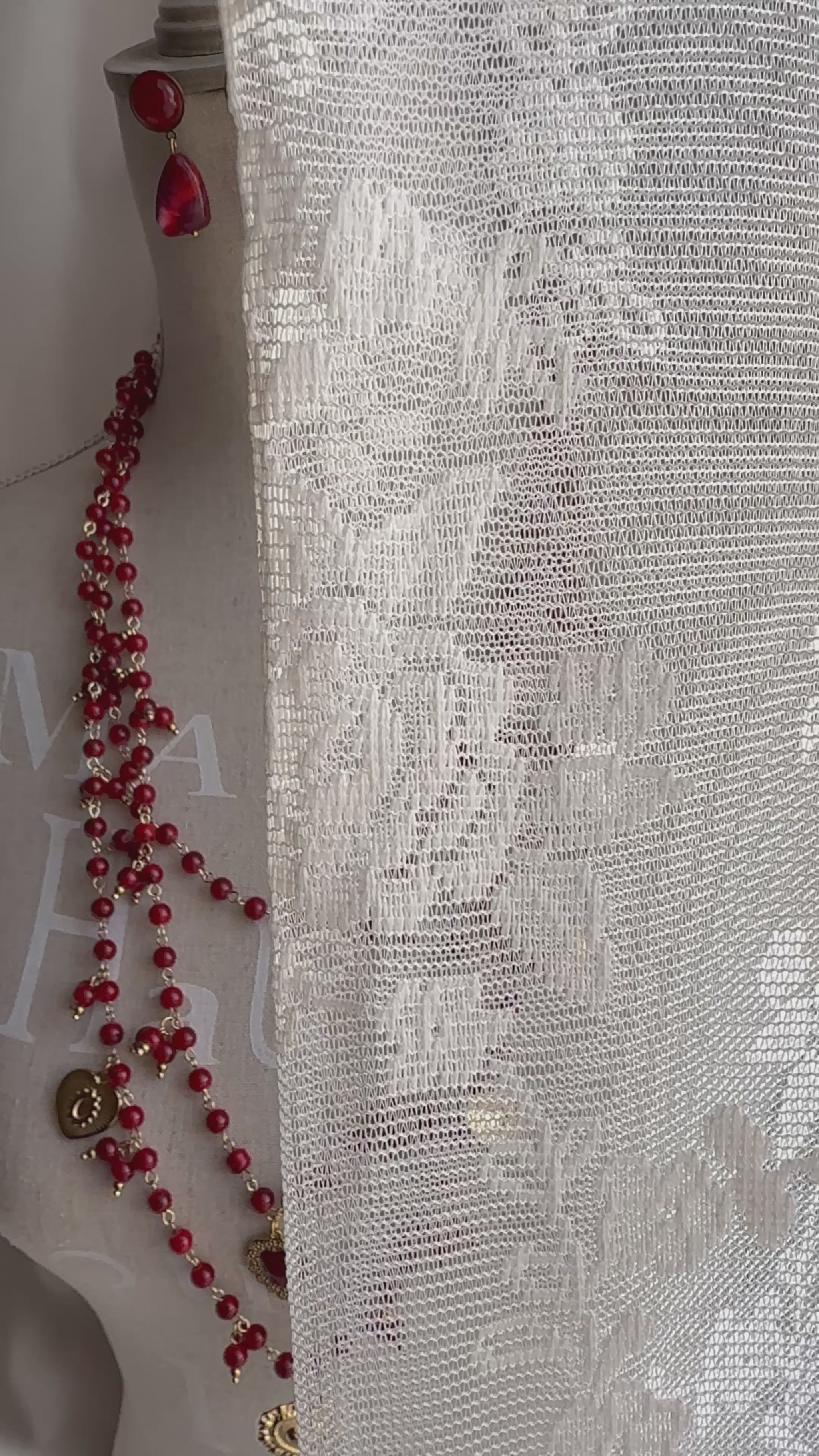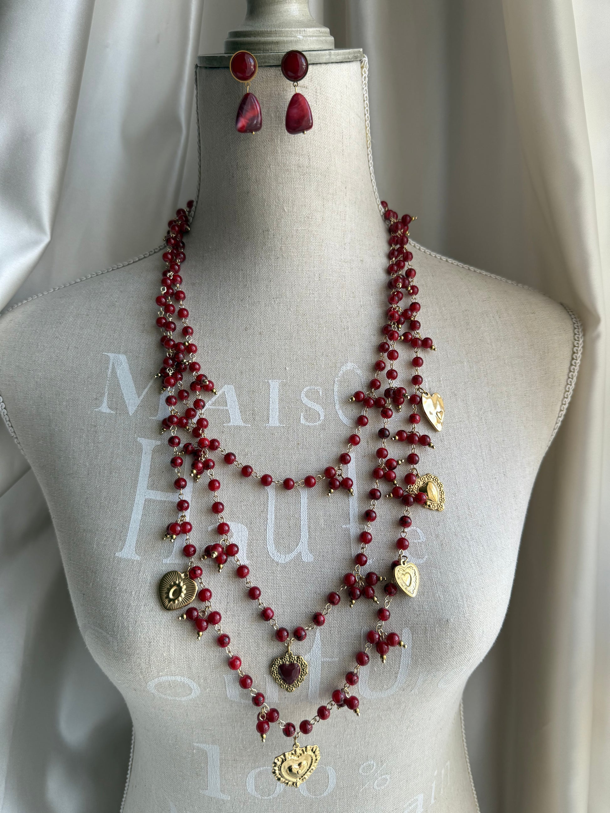 Collana a più fili con pietre rosse e charms a cuore in acciaio inox, sinonimo do amore forza e devozione.