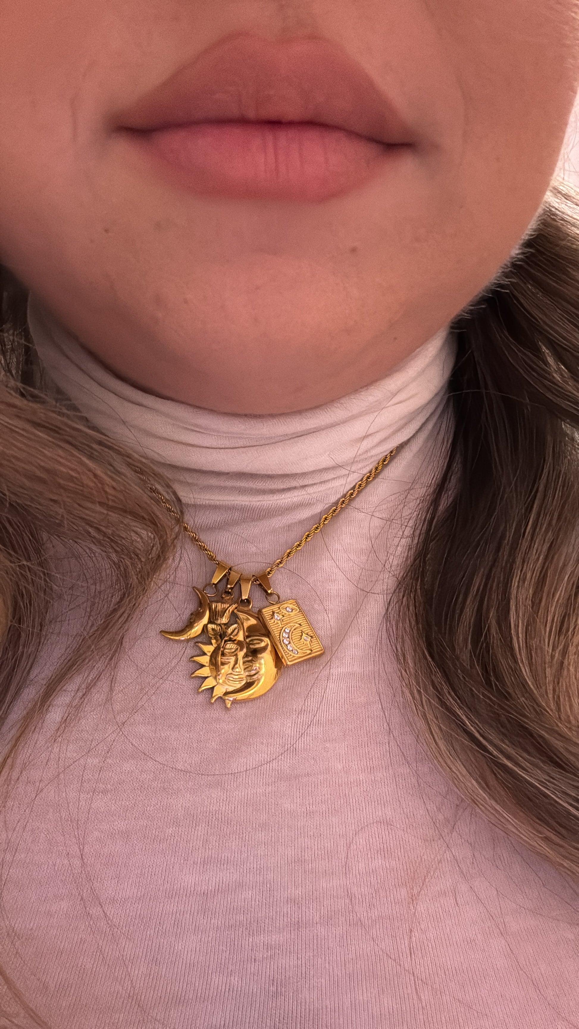 Colonna com 4 ciondoli removiboli. Rosa, sole luna, mezzaluna e carta magica