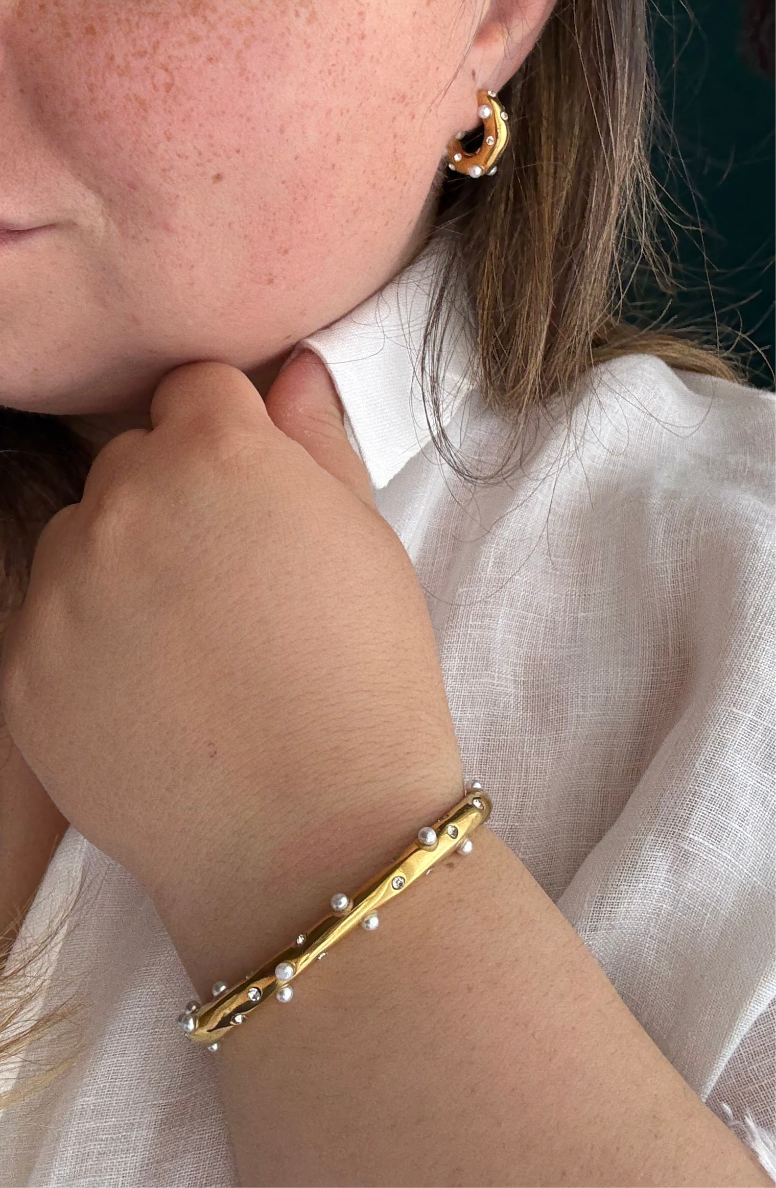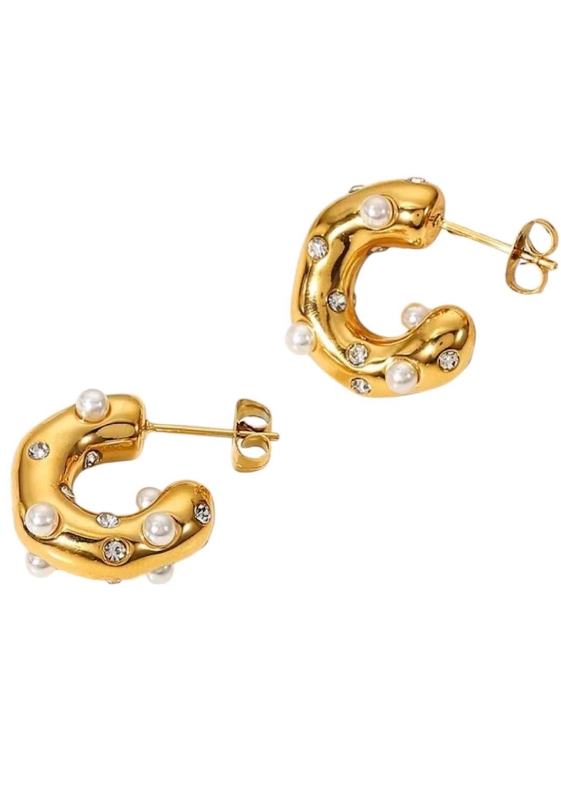 orecchini in acciaio inox con zirconi e microperle. placcati oro 18k