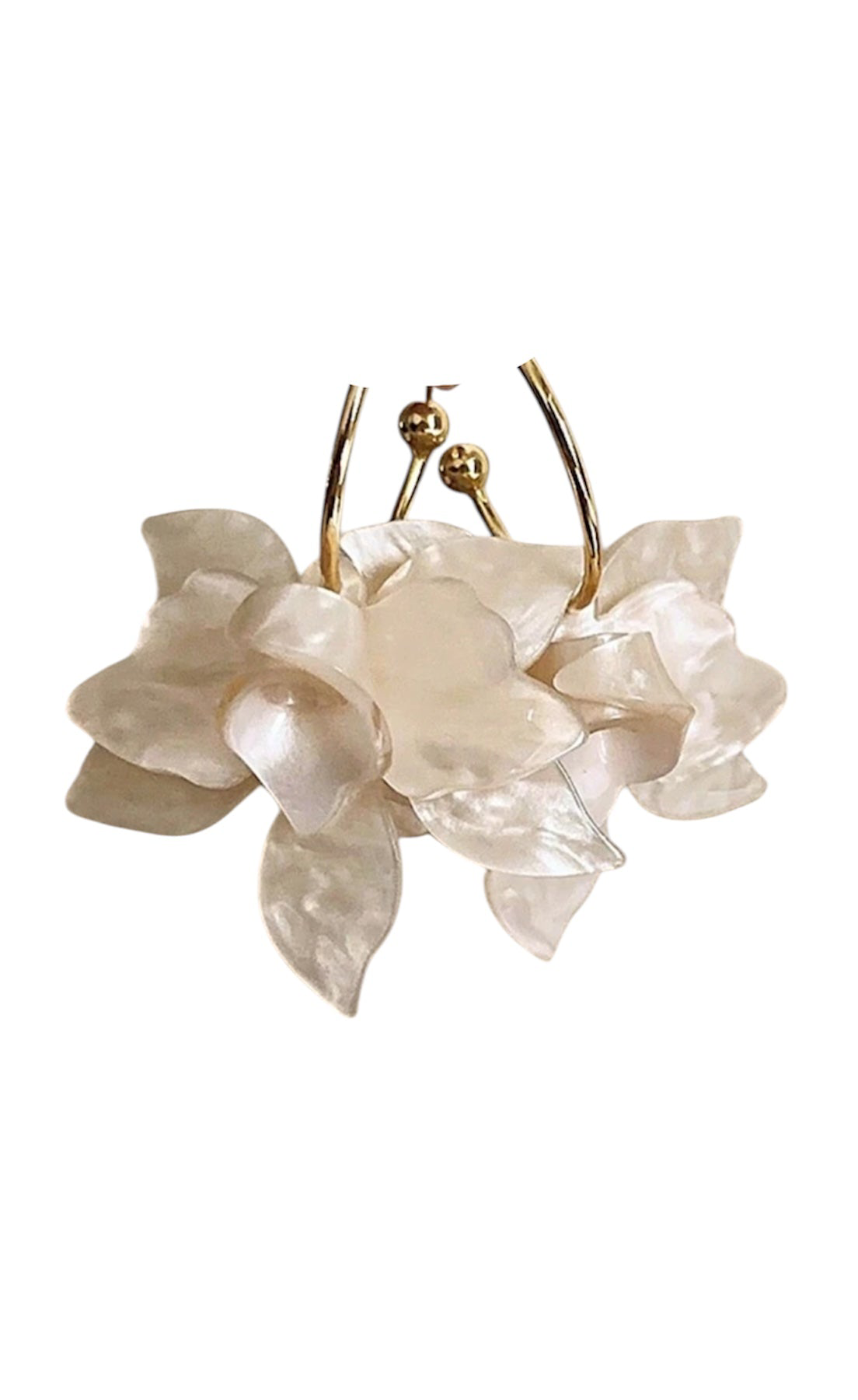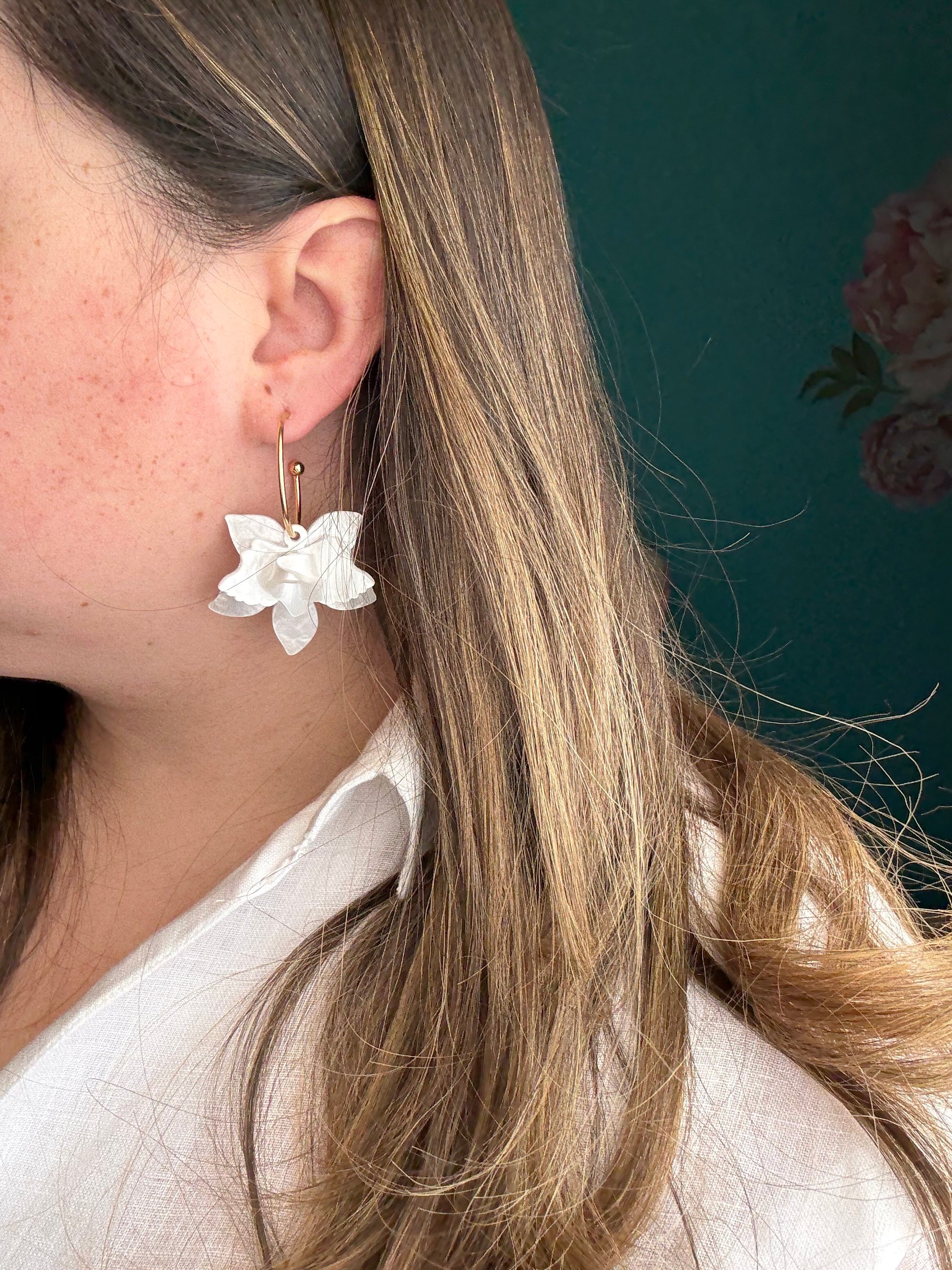 Orecchini in argento 925 con fiore in resina bianco, effetto madreperla, removibile.