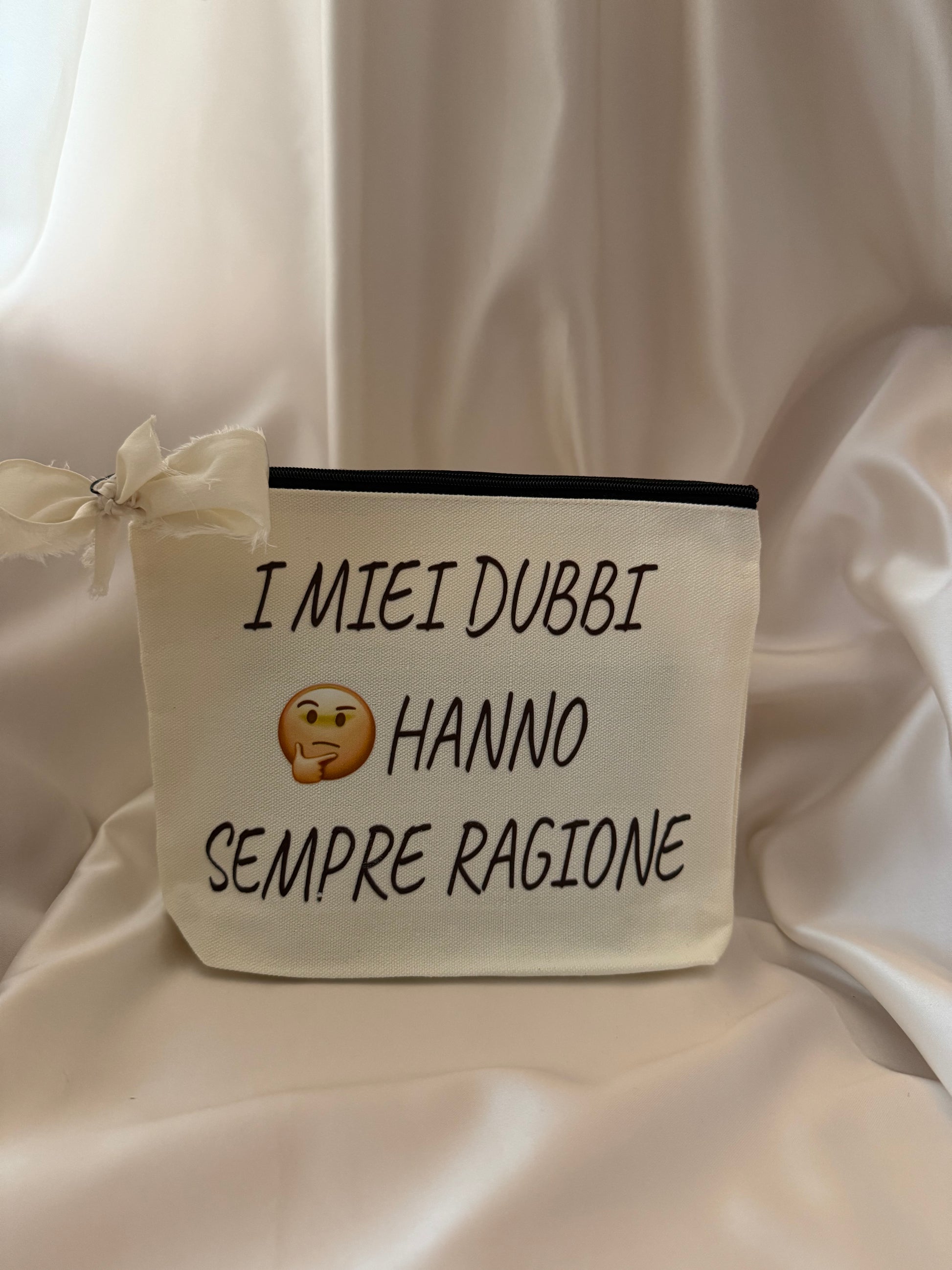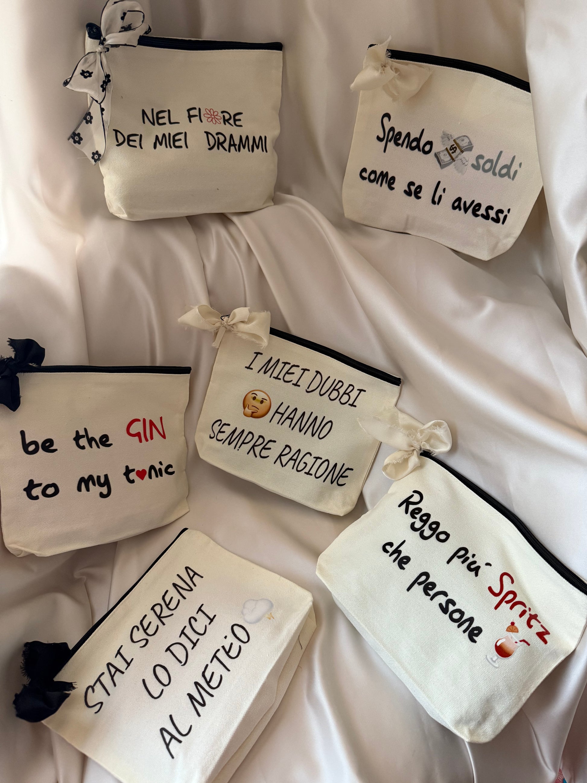 Le pochette Una Gioia con frasi ironiche sono realizzate in 100% cotone naturale, perfette per custodire i tuoi piccoli indispensabili con stile… e un pizzico di sarcasmo