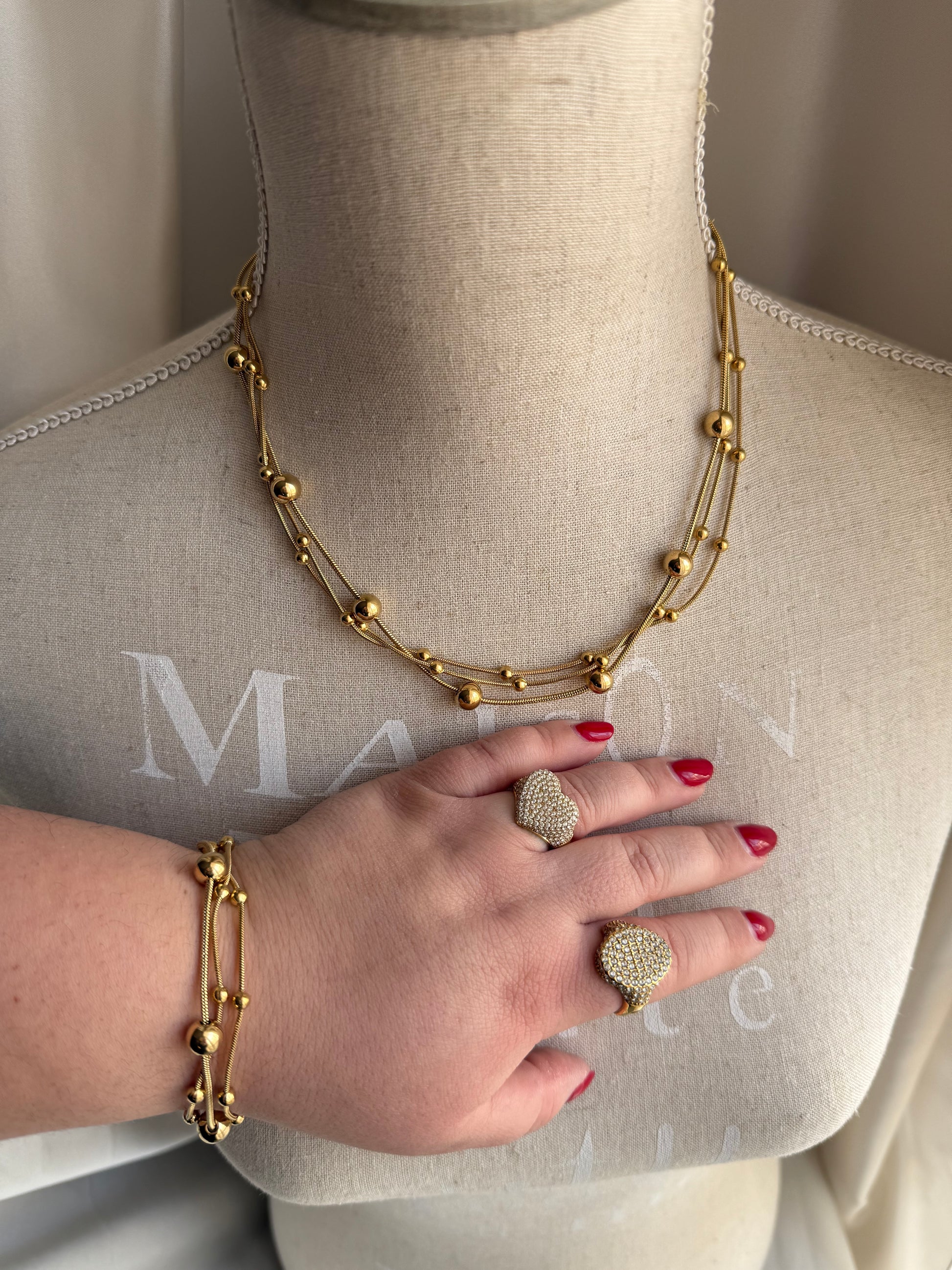 Bracciale e collana in acciaio inox a 3 fili con perline di diverse dimensioni.